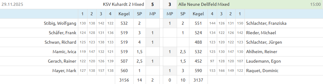 Die erste Garnitur der Alle Neune Dellfeld musste am vergangenen Spieltag eine unerwartete Niederlage bei der KSV Kuhardt 2 Mixed hinnehmen. Trotz einer herausragenden Einzelleistung von Dominic Raquet, der mit starken 590 Holz glänzte, konnte die Mannschaft die Partie nicht für sich entscheiden. Zwei Ergebnisse unter der 500er Marke erwiesen sich am Ende als zu große Hypothek. Mit einem Gesamtergebnis von 3137 Holz unterlag Dellfeld knapp gegen die Gastgeber, die 3156 Holz erzielten. In der Punktewertung stand es am Ende 3:5 – ein Resultat, das die enge und spannende Begegnung widerspiegelt.