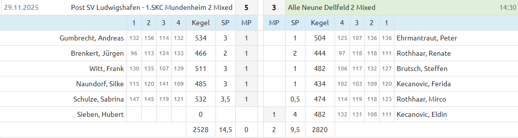 Im Kellerduell der 2. Mixed-Mannschaft von Alle Neune Dellfeld gegen die Post SV Ludwigshafen – 1. SKC Mundenheim 2 Mixed musste das Team eine bittere Niederlage hinnehmen. Obwohl die Gastgeber mit einem Spieler weniger an den Start gingen, reichte es für Dellfeld nicht zum erhofften Erfolg. Nach Punkten unterlag man mit 3:5, obwohl die Holz Zahl klar gegen die Gäste sprach: 2820 Holz standen den 2528 Holz der Ludwigshafener gegenüber. Damit blieb der erhoffte Befreiungsschlag im Tabellenkeller aus und die Mannschaft wartet weiterhin auf ein Erfolgserlebnis. Ein Lichtblick war erneut die Leistung von Peter Ehrmanntraut. Der älteste Aktive im Dellfelder Team zeigte mit 504 Holz einmal mehr seine Klasse und war bester Spieler seiner Mannschaft. Doch die fehlende mannschaftliche Geschlossenheit verhinderte, dass Dellfeld den Vorteil der zahlenmäßigen Überlegenheit nutzen konnte.