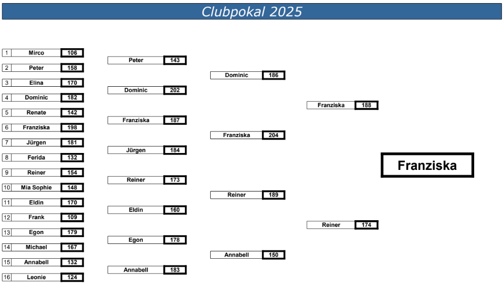 Zum zehnten Jubiläum hatte sich Sportwart Reiner Ahlheim einen neuen Modus überlegt, welche die Veranstaltung noch spannender gestalten sollte. Im Sprintmodus über zwei Sätze zu je 10 Wurf Volle, 10 Wurf Abräumen gingen 15 Starter*innen auf die Jagd nach der begehrten Trophäe. Das „Losglück“ entschied dabei über die Konstellationen und den Turnierbaum. Besonders Glück hatte dabei unser Vereinsneuling Michael Rieder, der direkt zu Beginn das Freilos für das Viertelfinale erhielt.