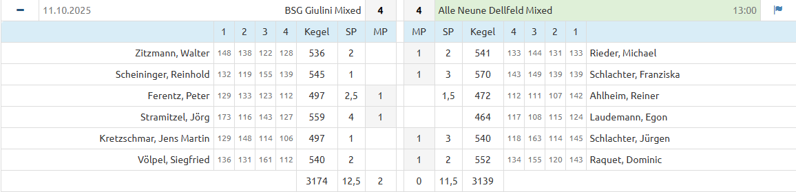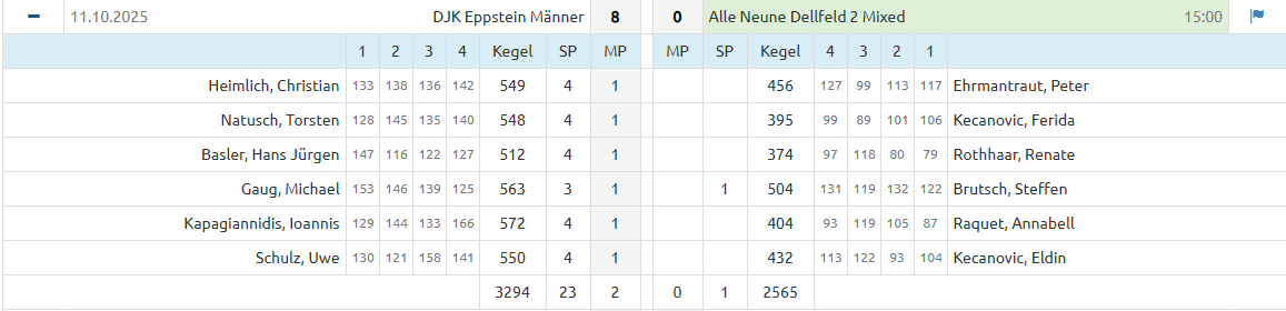 Die zweite Mixed-Mannschaft von Alle Neune Dellfeld trat erstmals auf den neuen Bahnen in Eppstein an – doch der erhoffte Erfolg blieb aus. Die Mannschaft hatte große Schwierigkeiten mit den ungewohnten Bedingungen, was sich deutlich im Ergebnis widerspiegelte. Während sich das gesamte Team schwertat, konnte lediglich Steffen Brutsch mit 504 Holz die 500er-Marke knacken und damit ein kleines Ausrufezeichen setzen. Am Ende stand eine klare 0:8-Niederlage zu Buche. Auch in der Gesamtholzzahl war der Unterschied deutlich: 3294 zu 2565 Holz zugunsten der Gastgeber aus Eppstein.