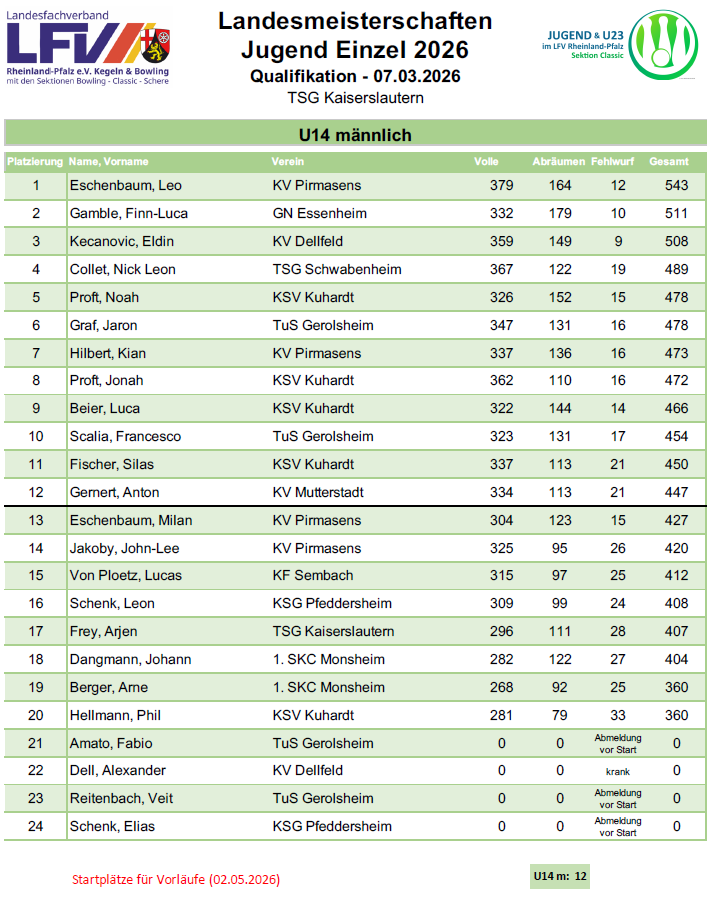 Die Jugendlichen des KV Dellfeld haben in der Landesjugendrunde 2025/2026 starke Leistungen gezeigt und sich in mehreren Altersklassen hervorragend präsentiert. Besonders erfreulich: Eldin Kecanovic erreichte in der U14m einen hervorragenden 3. Platz und damit die beste Platzierung aller Dellfelder Starterinnen und Starter. Die Ergebnisse der übrigen Jugendlichen zeigen ebenfalls eine positive Entwicklung und viel Potenzial für die kommenden Jahre.