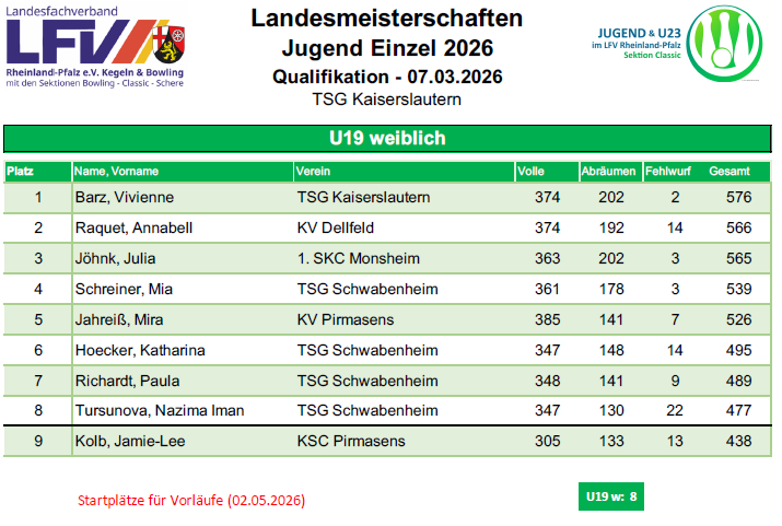 - Leonie Herrmann: 284 Holz (Aufgabe nach 99 Wurf verletzungsbedingt)